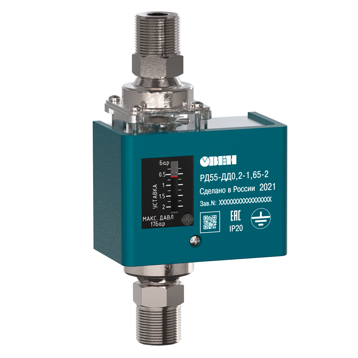 РД55 представляет собой механическое реле перепада давления для коммутации электрических цепей в зависимости от изменения разности двух давлений измеряемой среды. Принцип действия реле состоит в сравнении двух давлений, подаваемых с двух сторон на сильфон, который, деформируясь, переключает однополюсный перекидной контакт. Порог срабатывания реле настраивается пользователем.