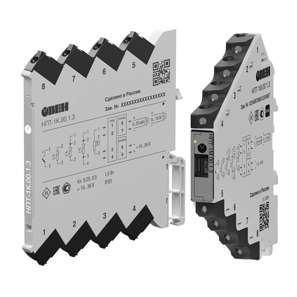 ОВЕН НПТ – серия универсальных преобразователей сигналов термометров сопротивлений, термопар, сопротивлений и потенциометров в унифицированные сигналы тока и напряжения: 4…20 мА, 0…20 мА, 0…5 мА, 0…10 В, 0…5 В, 2…10 В.