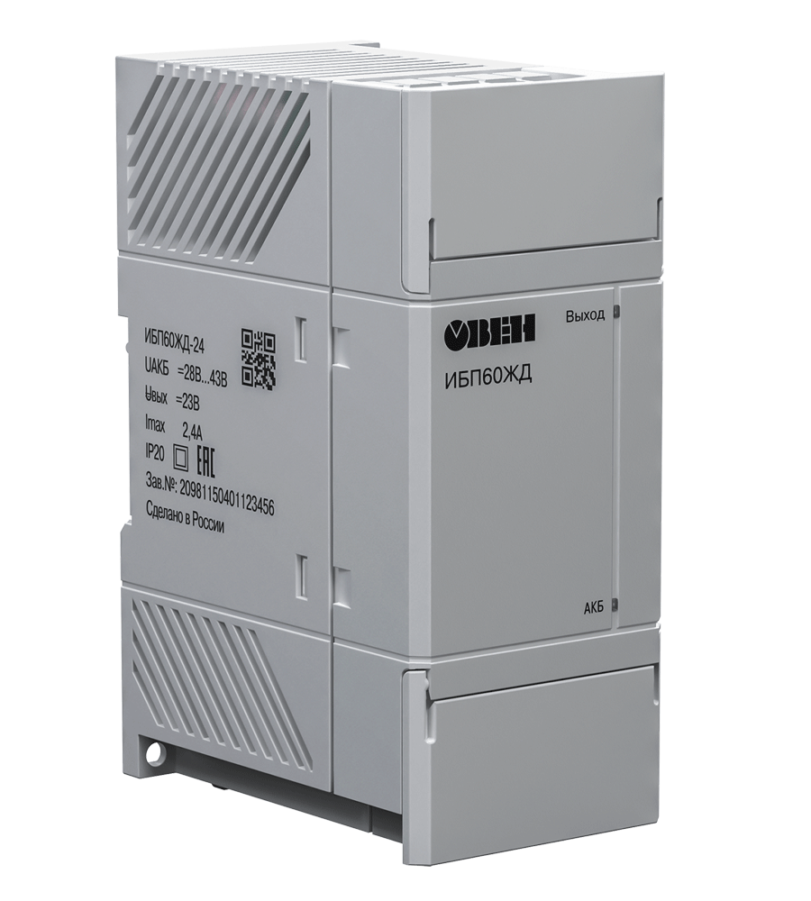 ОВЕН ИБП60ЖД-24 предназначен для использования в качестве резервированного источника вторичного питания при работе от источника постоянного тока ОВЕН БП60К 24 В или от резервной сети питания постоянного тока ЖД станций (28...43 В).