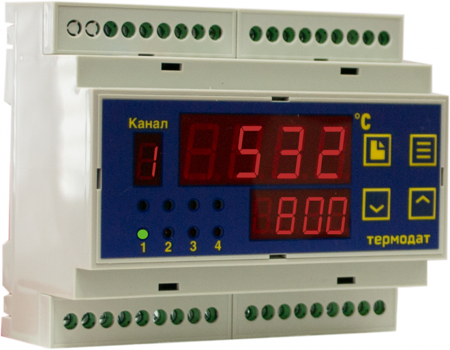 Термодат-13К6 - двух-, трех- или четырехканальный ПИД-регулятор температуры и аварийный сигнализатор со светодиодными индикаторами. Прибор имеет от двух до четырех универсальных входов, предназначенных для подключения термопар или термосопротивлений, а также датчиков с токовым выходом. Разрешение 1°С или 0,1°С задается пользователем. Может управлять как нагревателем, так и охладителем. Интуитивно понятное управление обеспечивается 4 кнопками внизу экрана.