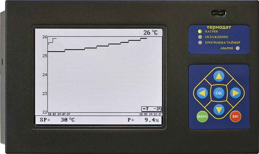 Термодат-18Е6 - одноканальный регулятор температуры по программе и электронный самописец с графическим 6" дисплеем. Возможные опции - USB-разъемом для снятия архивных данных на Flash-носитель и Ethernet-разъем. Прибор имеет универсальный вход, предназначенный для подключения термопар или термосопротивлений, а также датчиков с токовым выходом. Разрешение 1°С или 0,1°С задается пользователем. Может управлять как нагревателем, так и охладителем. Интуитивно понятное управление обеспечивается 7 кнопками справа от экрана.