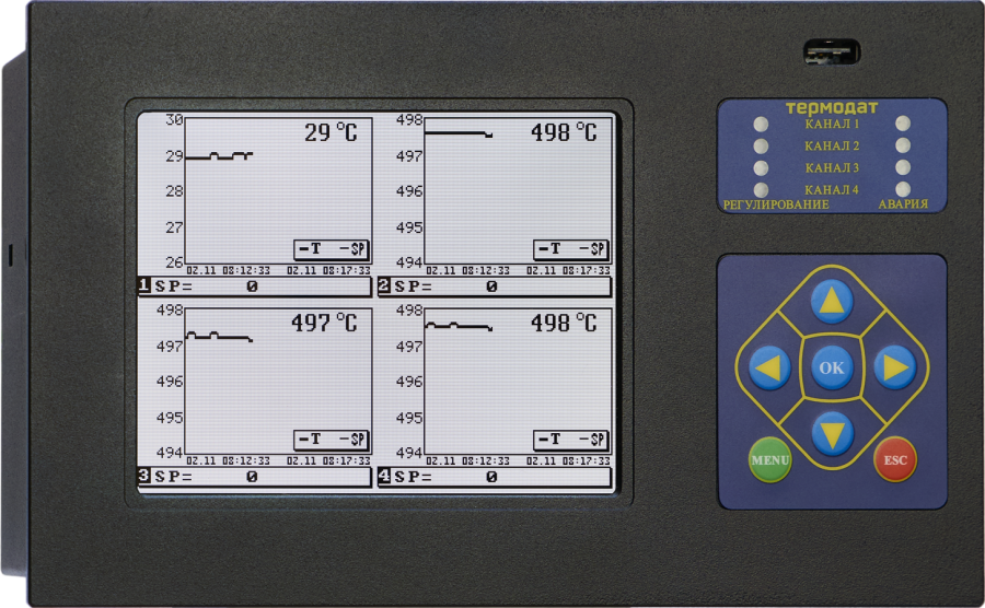 Термодат-19М6 - четырехканальный измеритель температуры, аварийный сигнализатор с графическим 6" дисплеем. Электронный самописец. Возможные опции - USB-разъемом для снятия архивных данных на Flash-носитель и Etnernet-разъем. Прибор имеет универсальный вход, предназначенный для подключения термопар или термосопротивлений, а также датчиков с токовым выходом. Разрешение 1°С или 0,1°С задается пользователем. Интуитивно понятное управление обеспечивается 7 кнопками справа от экрана.